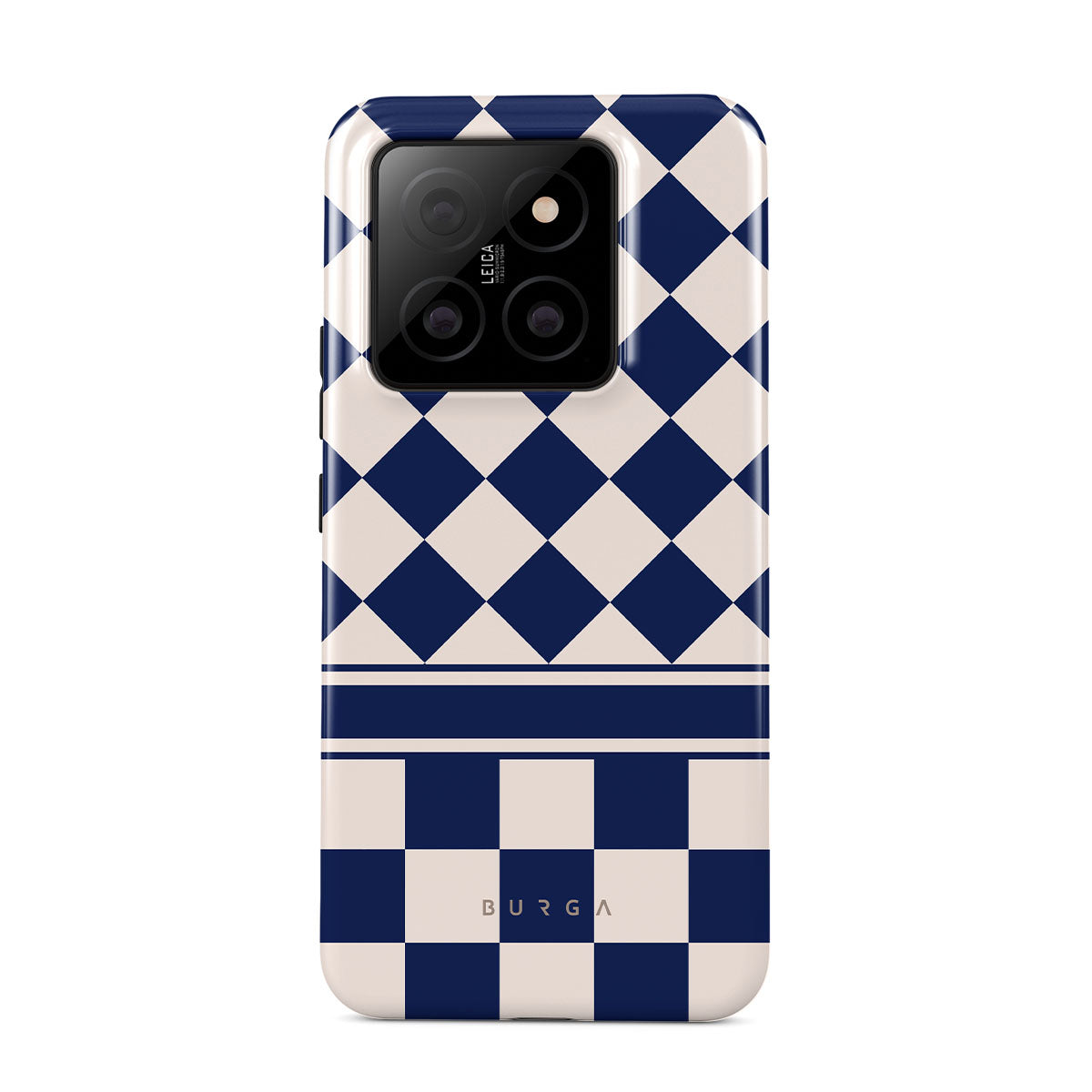 Embrace the essence of subtle luxury with our Check & Mate Xiaomi 14 phone case design. Blending eggshell and deep blue checkers, it evokes whispers of elegance. While diamonds grace the upper half, the lower half features a timeless chessboard pattern.