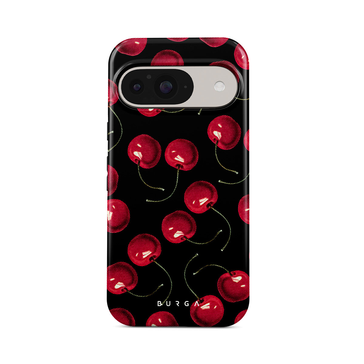 On a deep black background, rich red cherries stand out. Tempting and audacious, our Cherrybomb Google Pixel 10 Pro XL phone case design is perfect for anyone who likes to keep things simple yet striking.
