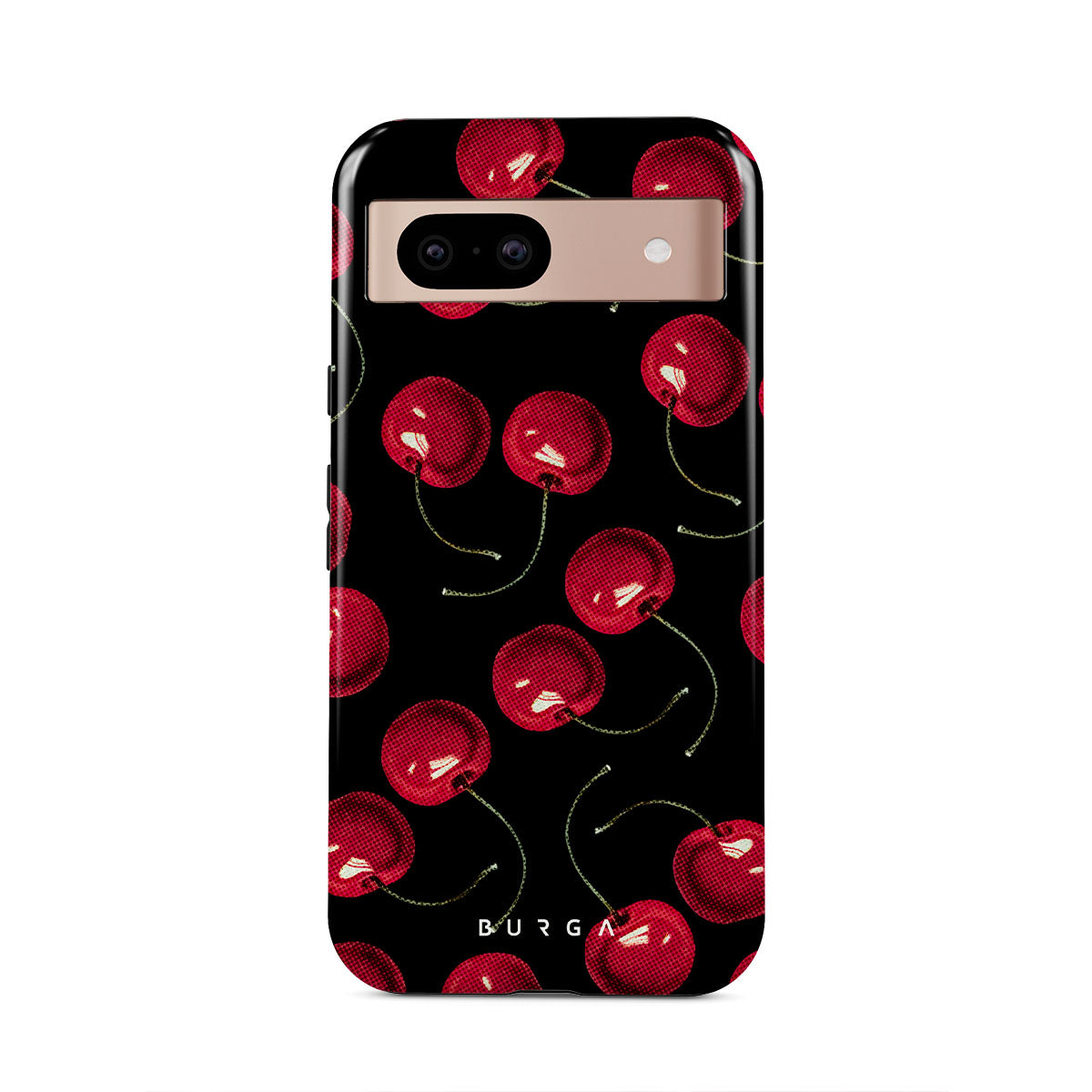 On a deep black background, rich red cherries stand out. Tempting and audacious, our Cherrybomb Google Pixel 8a phone case design is perfect for anyone who likes to keep things simple yet striking.