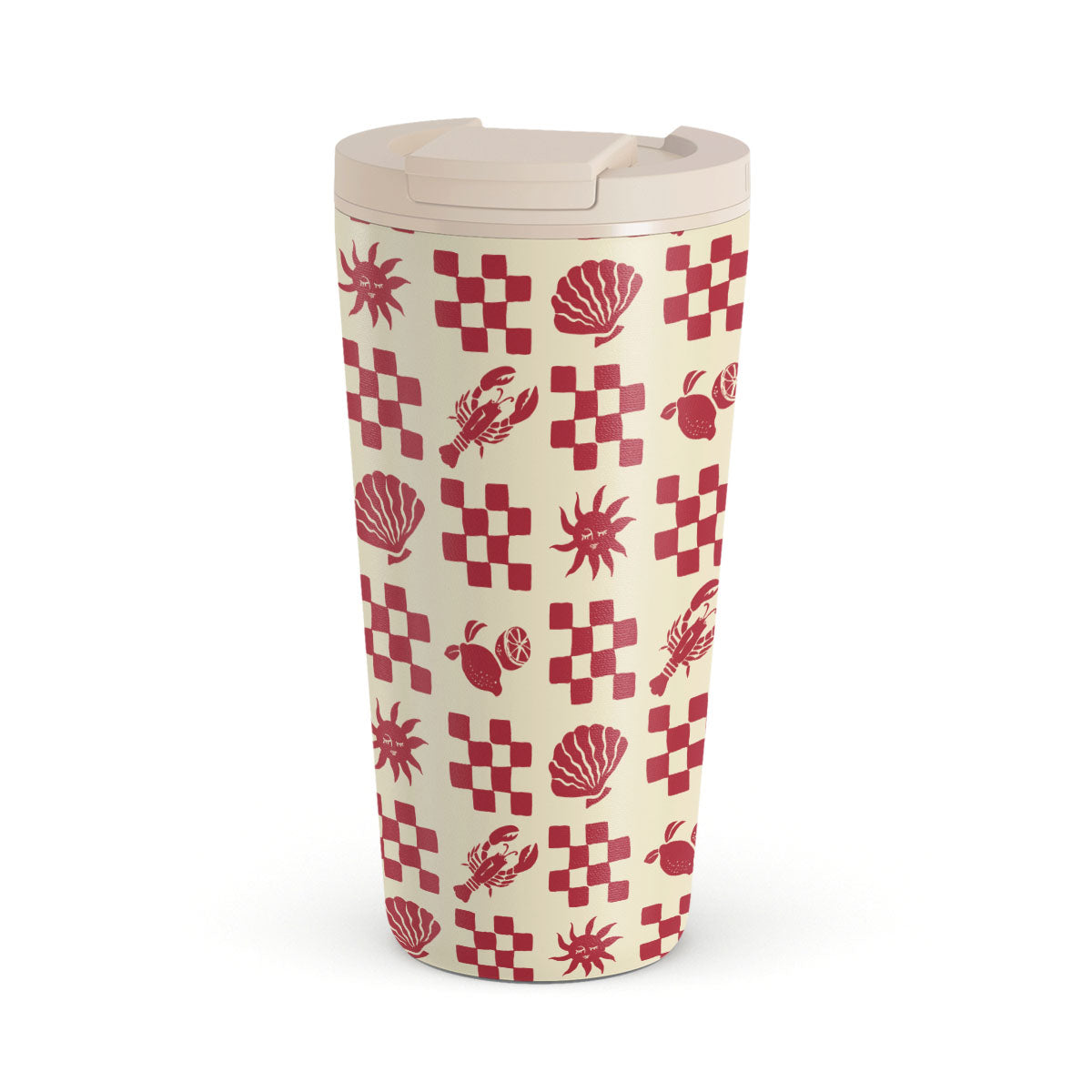 This design features: red checkered patterns, shells, lobster, Italian motifs.