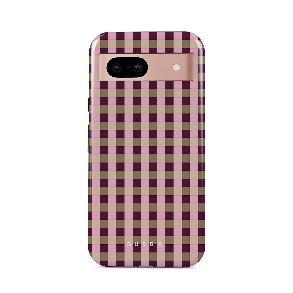 This design features: pink and burgundy plaid pattern, modern checkered style.