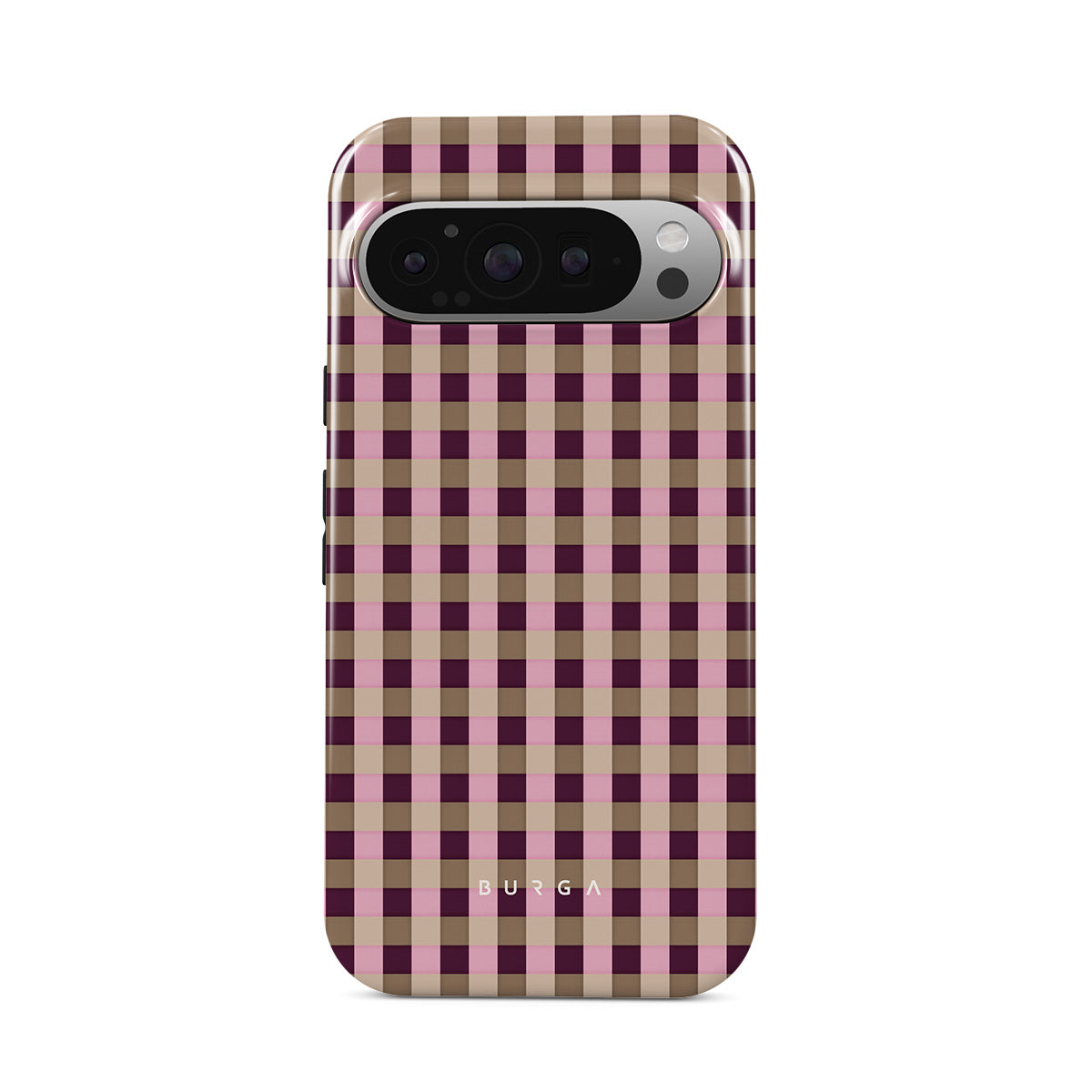 This design features: pink and burgundy plaid pattern, modern checkered style.