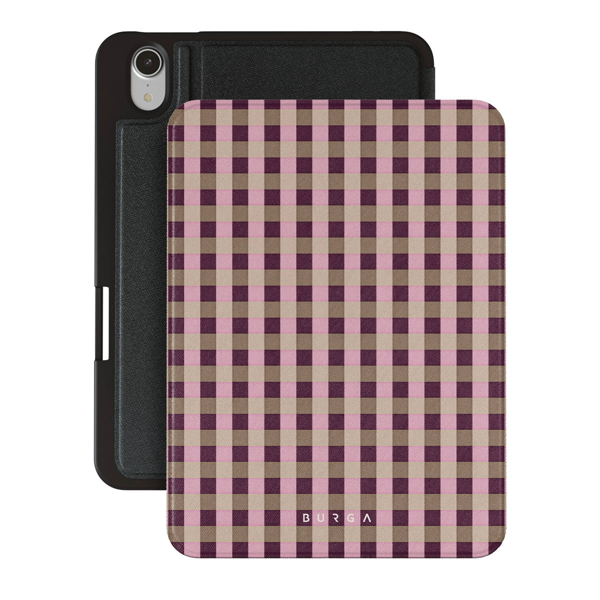 This design features: pink and burgundy plaid pattern, modern checkered style.