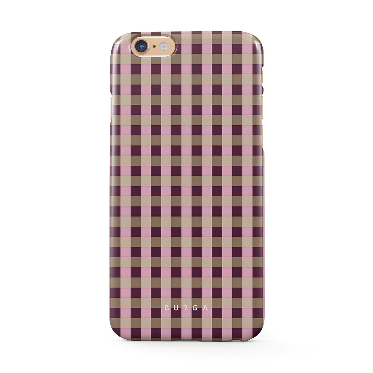 This design features: pink and burgundy plaid pattern, modern checkered style.