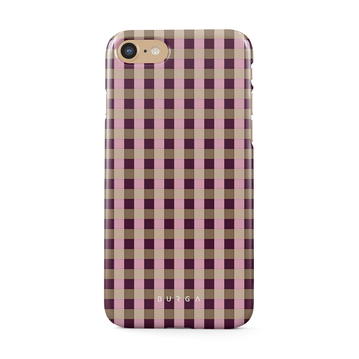 This design features: pink and burgundy plaid pattern, modern checkered style.