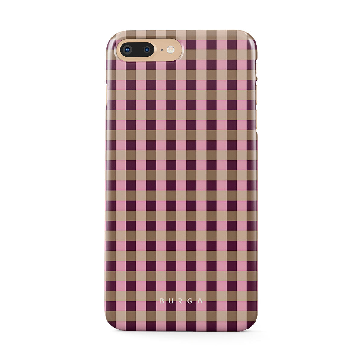 This design features: pink and burgundy plaid pattern, modern checkered style.
