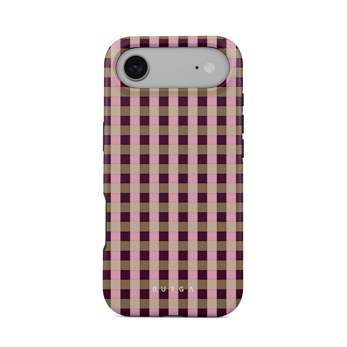 This design features: pink and burgundy plaid pattern, modern checkered style.