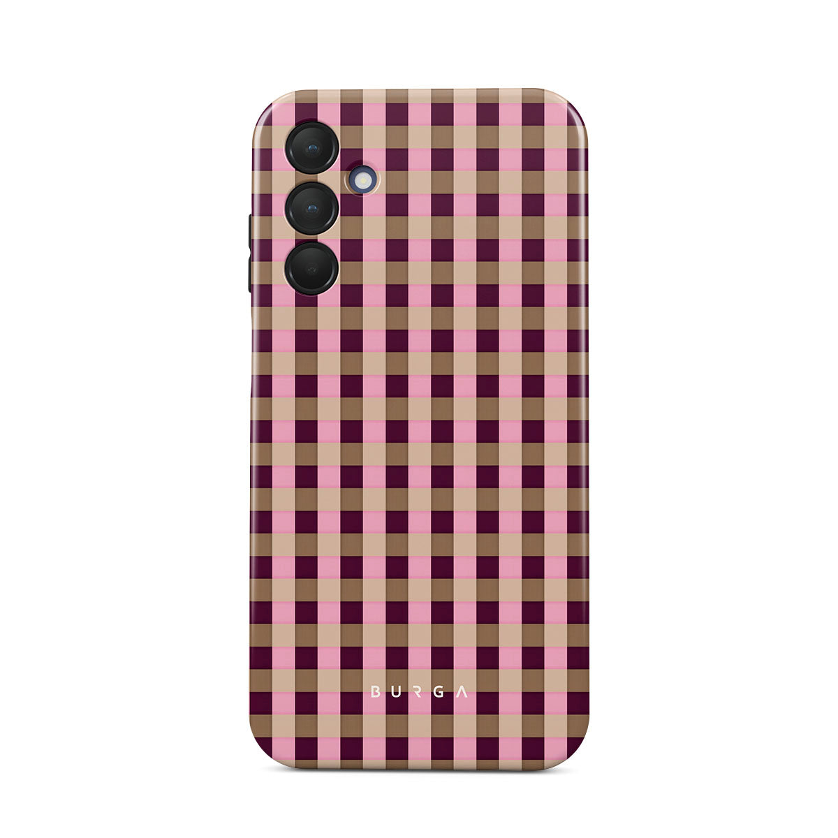 This design features: pink and burgundy plaid pattern, modern checkered style.
