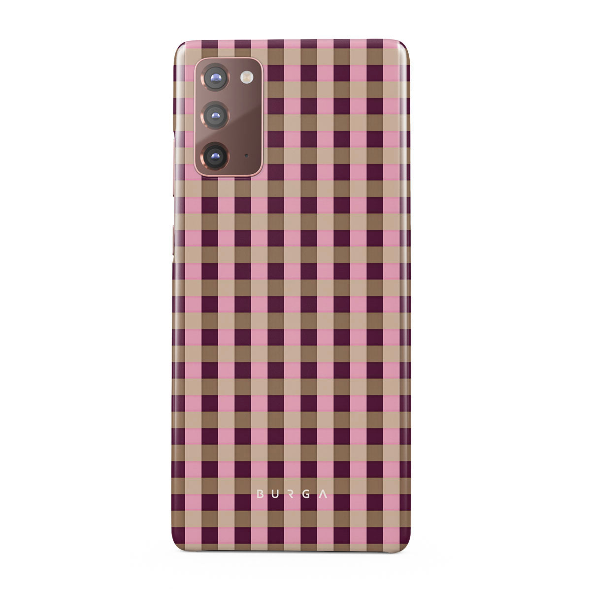 This design features: pink and burgundy plaid pattern, modern checkered style.