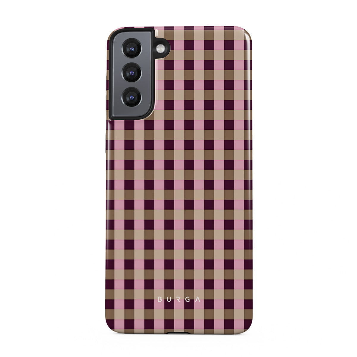 This design features: pink and burgundy plaid pattern, modern checkered style.