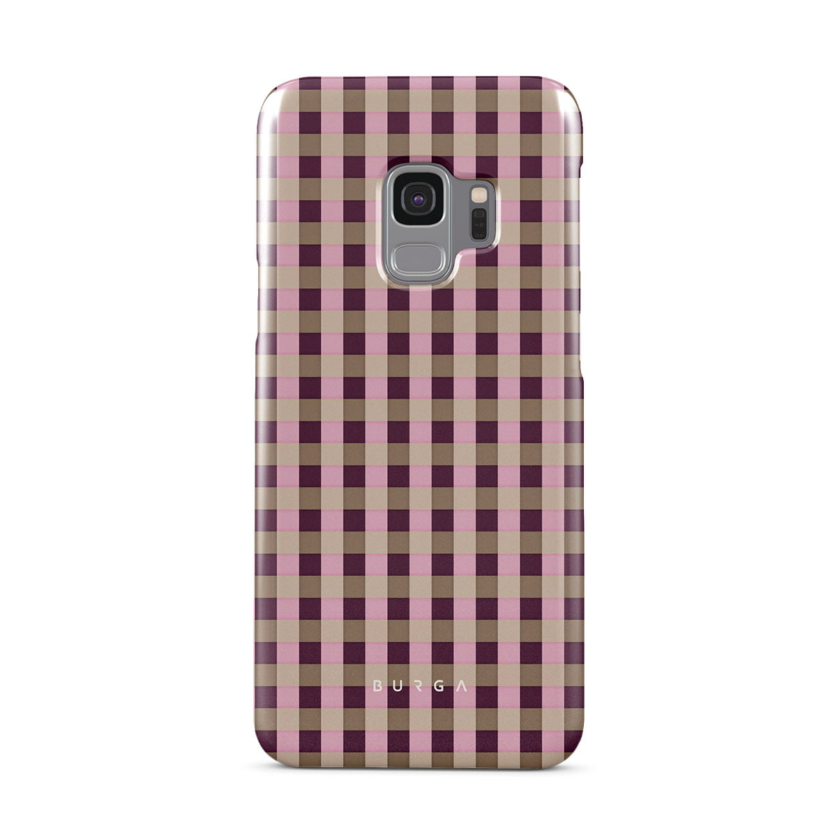 This design features: pink and burgundy plaid pattern, modern checkered style.