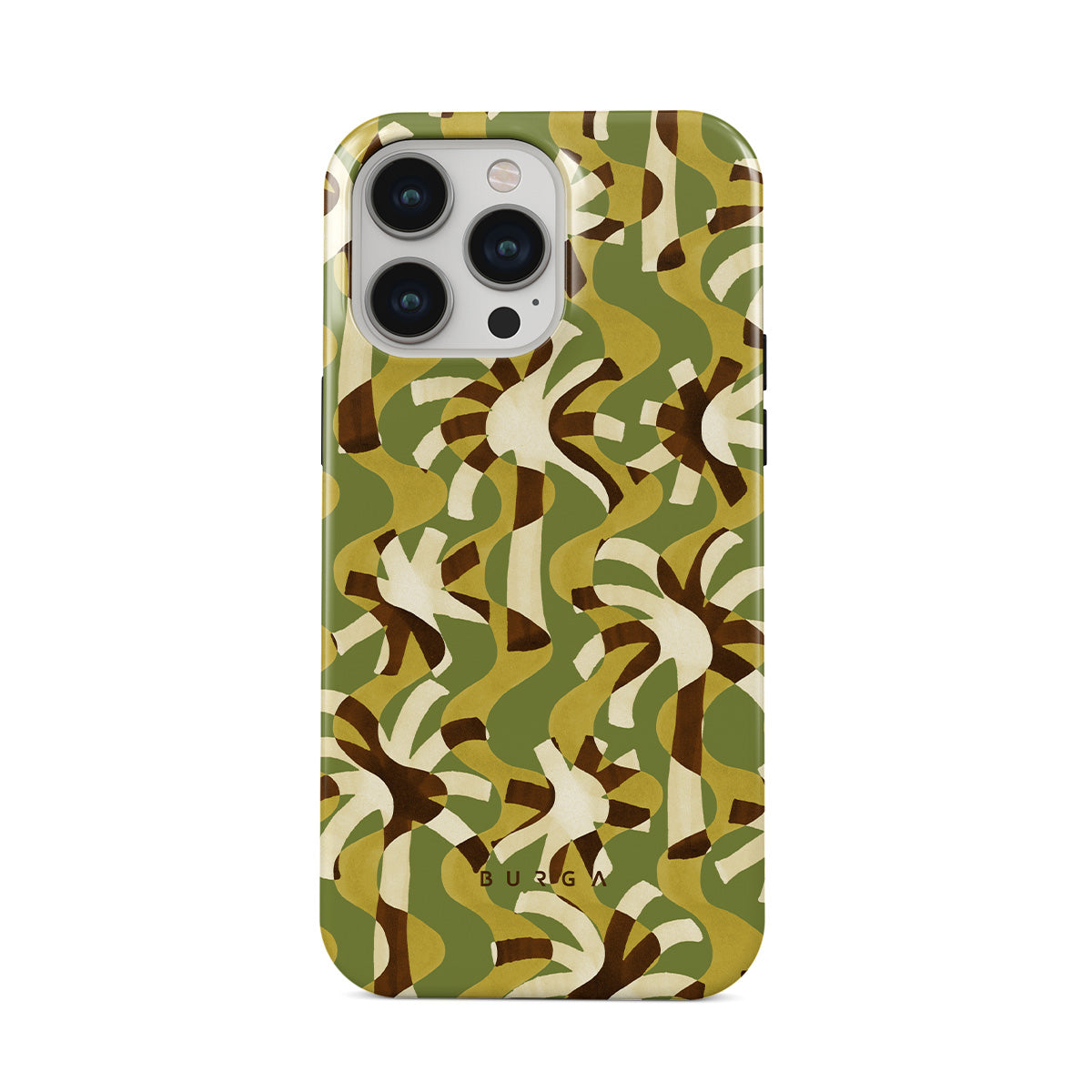 A leafy blur of tropical motion. This iPhone 14 Pro phone case design feels like a memory of a rainforest walk you never took, but wish you had. Hot, hazy, and happily lost.