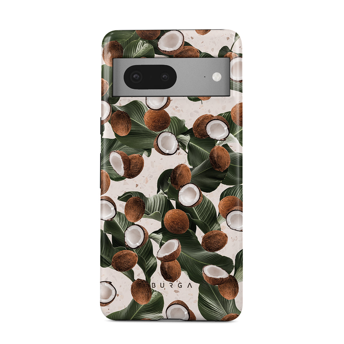 Coconut Crush Google Pixel 7a phone case showcases a soft creme color design with a playful addition of coconuts on top. The unexpected design duo will add a touch of tropical playfulness to your style while offering heavy-duty protection for your cell phone.
