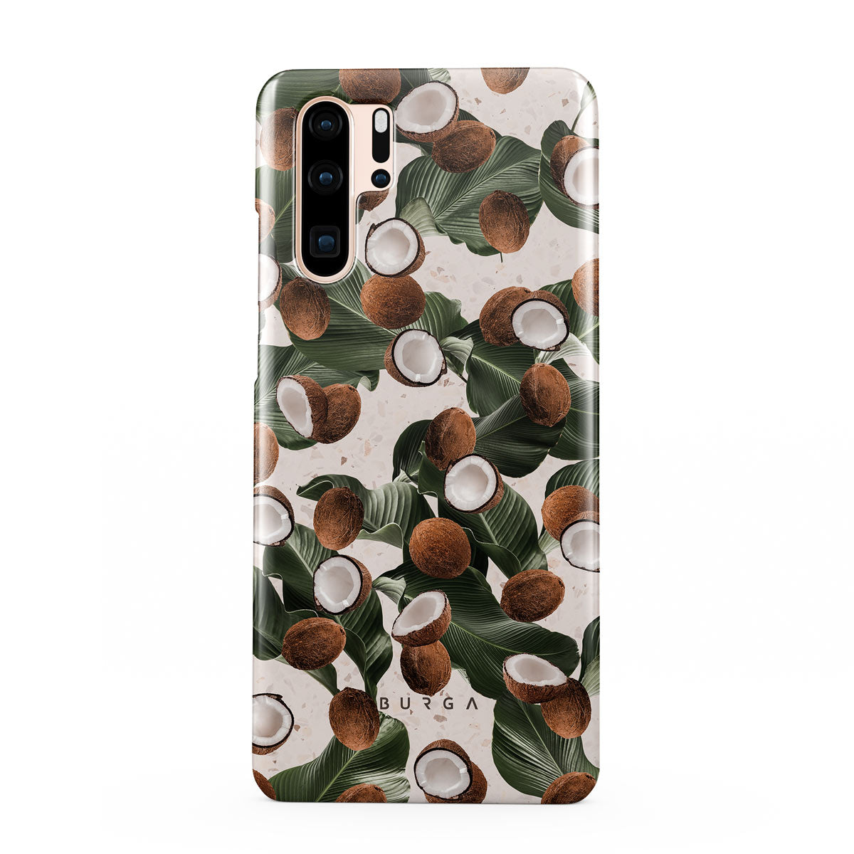 Coconut Crush Huawei P30 Pro phone case showcases a soft creme color design with a playful addition of coconuts on top. The unexpected design duo will add a touch of tropical playfulness to your style while offering heavy-duty protection for your cell phone.