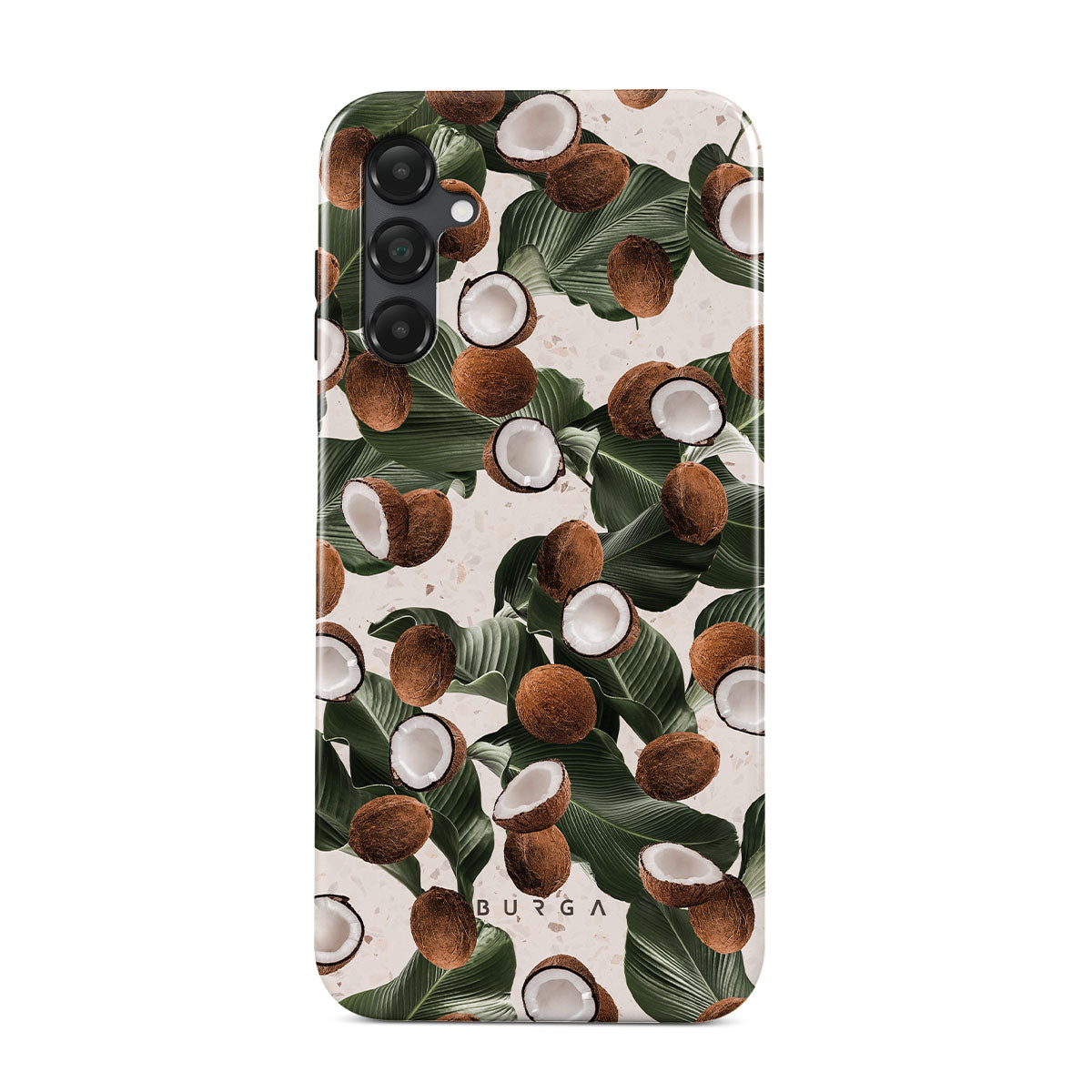 Coconut Crush Samsung Galaxy A25 phone case showcases a soft creme color design with a playful addition of coconuts on top. The unexpected design duo will add a touch of tropical playfulness to your style while offering heavy-duty protection for your cell phone.