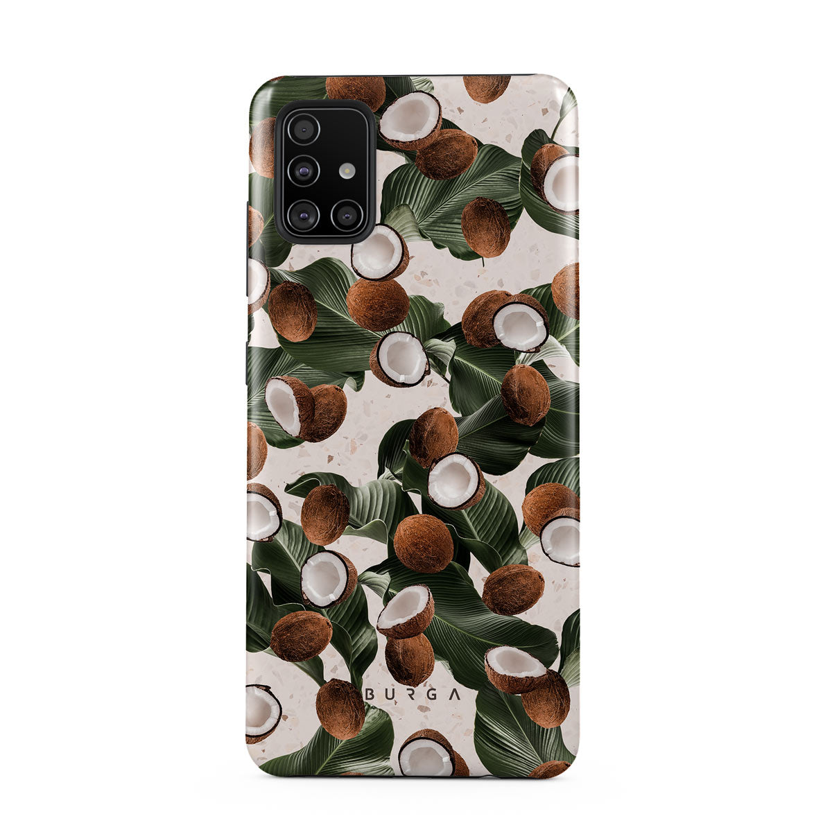 Coconut Crush Samsung Galaxy A51 phone case showcases a soft creme color design with a playful addition of coconuts on top. The unexpected design duo will add a touch of tropical playfulness to your style while offering heavy-duty protection for your cell phone.