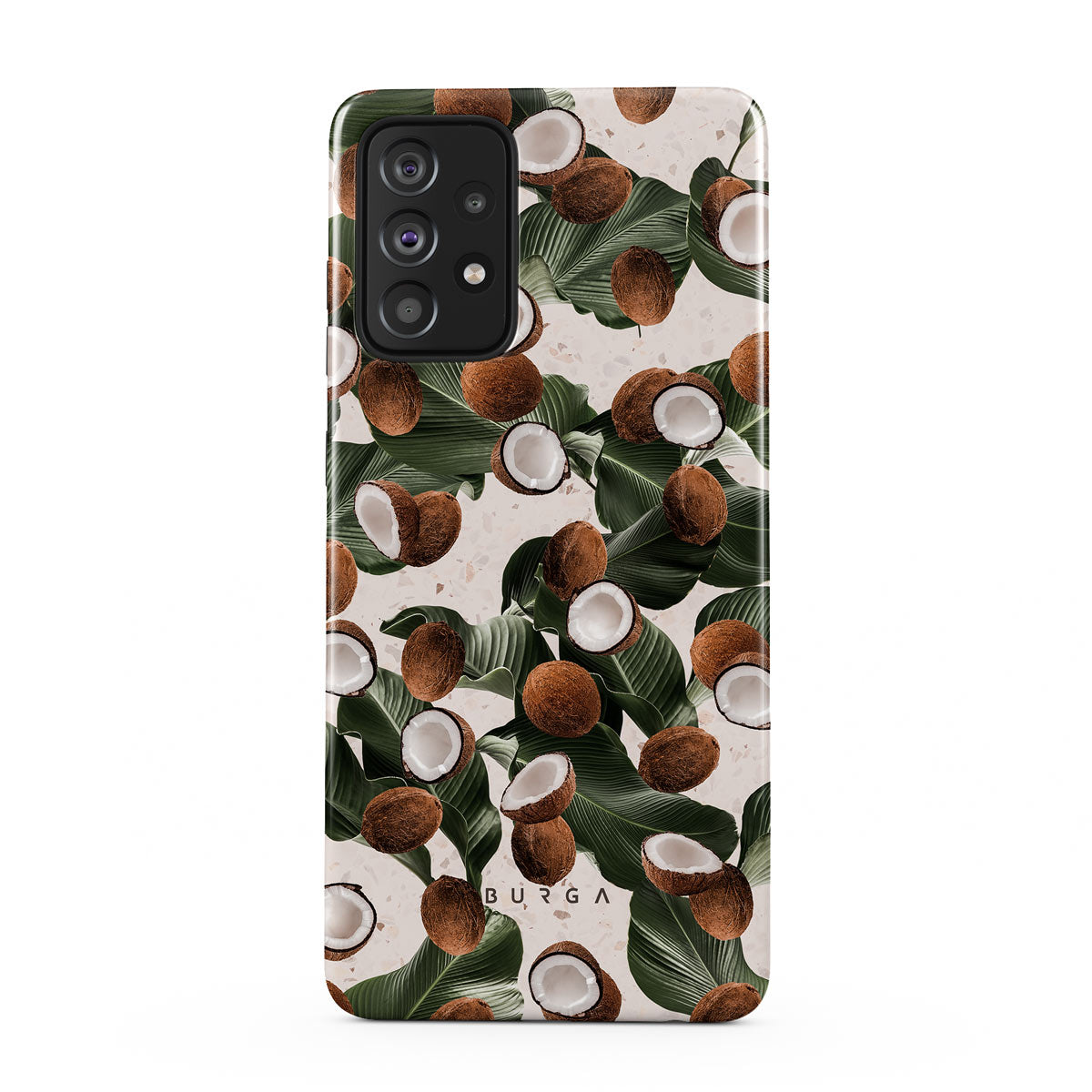 Coconut Crush Samsung Galaxy A52 / A52S 4G / 5G phone case showcases a soft creme color design with a playful addition of coconuts on top. The unexpected design duo will add a touch of tropical playfulness to your style while offering heavy-duty protection for your cell phone.