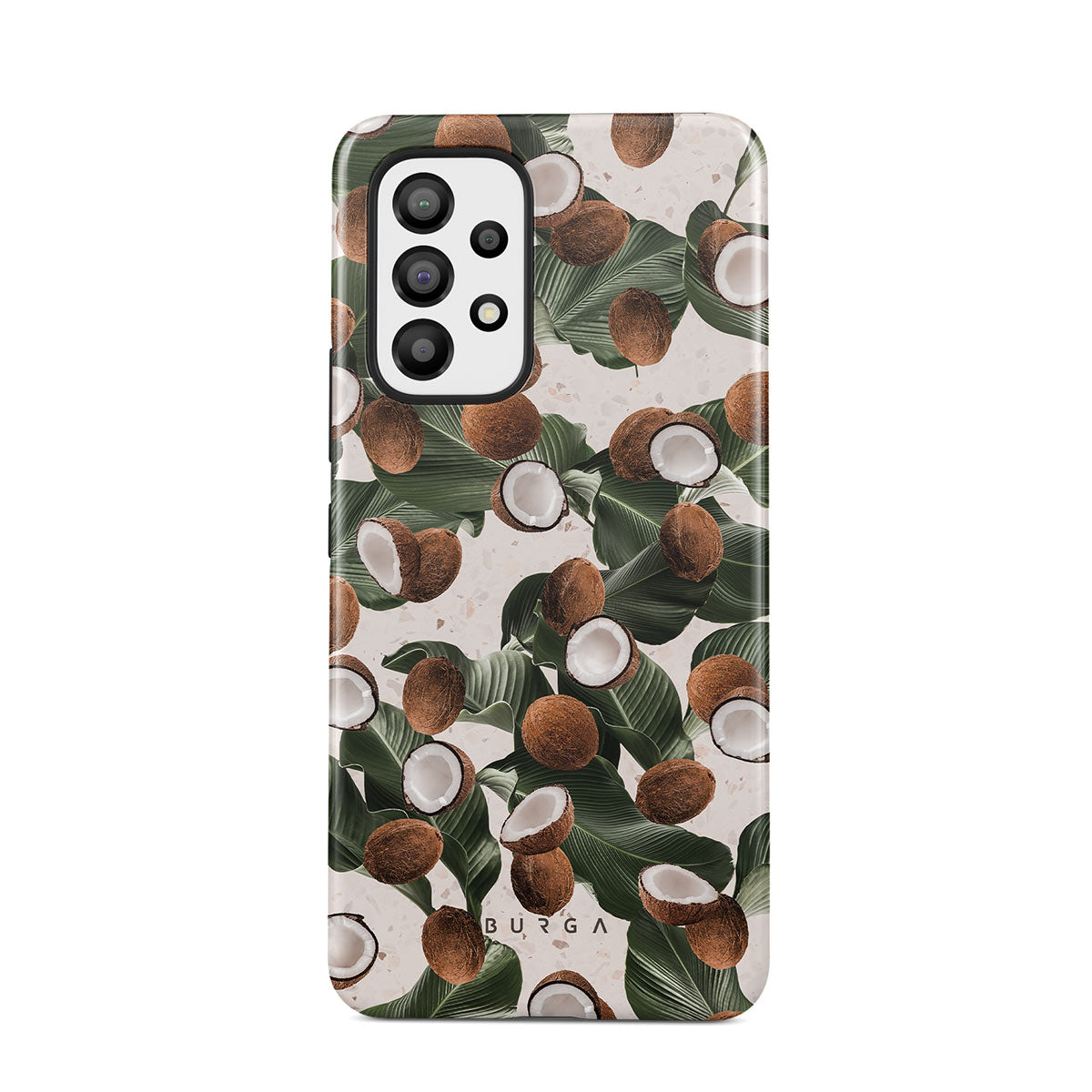 Coconut Crush Samsung Galaxy A72 phone case showcases a soft creme color design with a playful addition of coconuts on top. The unexpected design duo will add a touch of tropical playfulness to your style while offering heavy-duty protection for your cell phone.