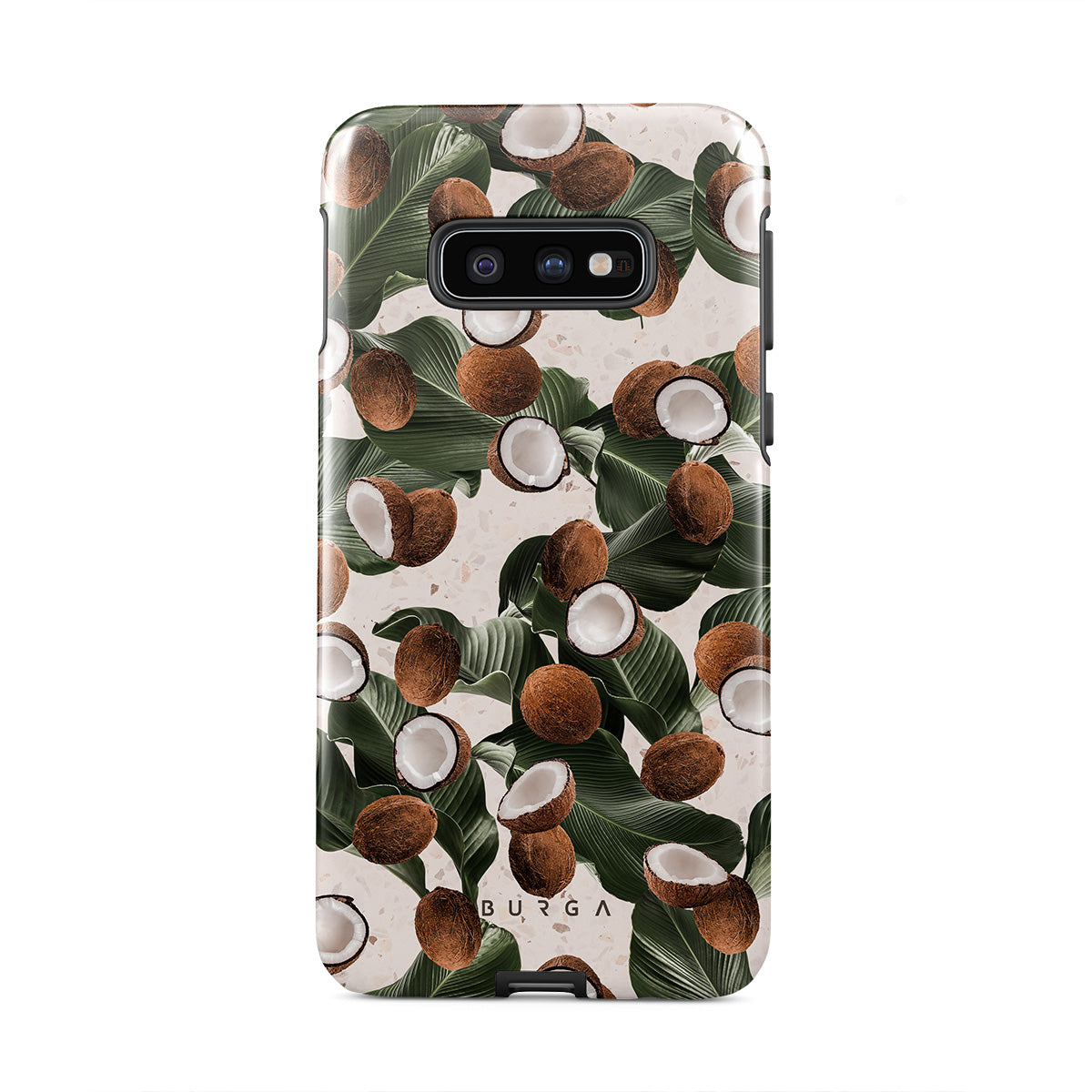 Coconut Crush Samsung Galaxy S10E phone case showcases a soft creme color design with a playful addition of coconuts on top. The unexpected design duo will add a touch of tropical playfulness to your style while offering heavy-duty protection for your cell phone.