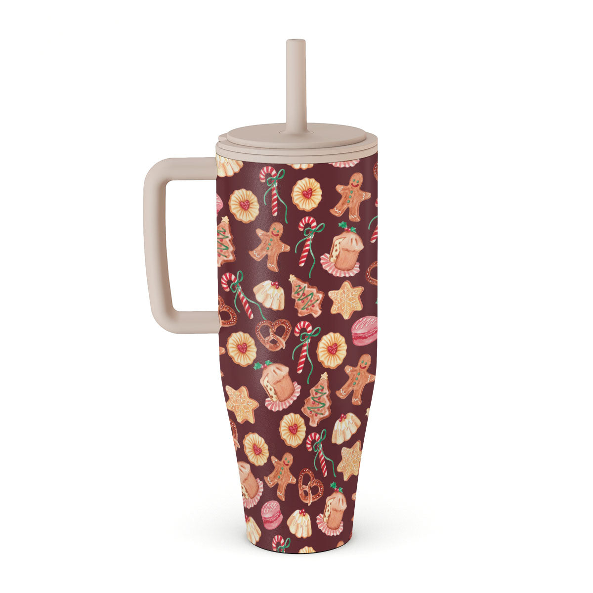 This design features: Christmas cookies, gingerbread men, candy canes, peppermint candies, festive sweets, burgundy red background
