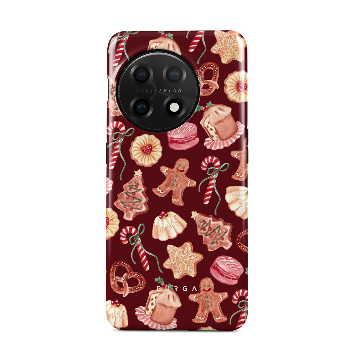 This design features: Christmas cookies, gingerbread men, candy canes, peppermint candies, festive sweets, burgundy red background