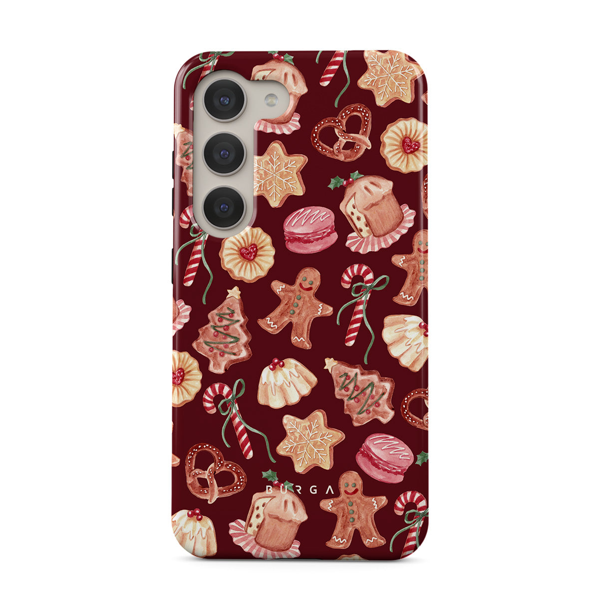 This design features: Christmas cookies, gingerbread men, candy canes, peppermint candies, festive sweets, burgundy red background