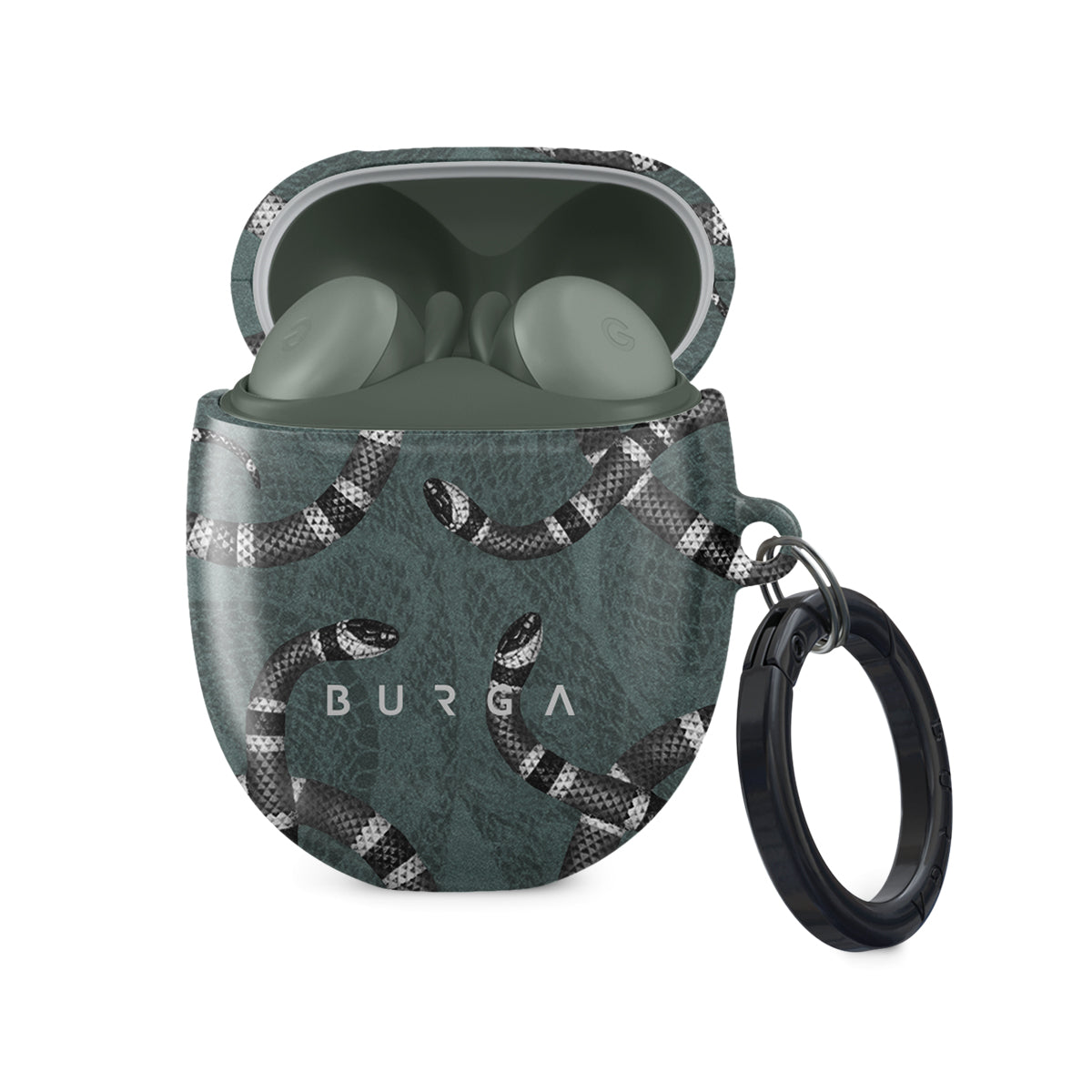 With the fabulous and fierce snake print Google Pixel Buds A case cover, match the deep shades of green to your style and make a gloomy mood match your aesthetics whenever you need a touch of coolness in your life. Our case fits perfectly snug around Google Pixel Buds A . “Like a glove!” one might say. And it won’t disrupt the wireless charging capabilities of the newer model. There’s even an LED light indicator to prove it (don’t worry, wired charging still works, too). When fitted, the BURGA case will protect the delicate Google Pixel Buds A case beneath it from scratches, bumps, and drops while remaining scratch-free itself. Our signature design pattern prints are High Quality, and will never peel or fade away- thanks to our unique printing technology. And finally, a handy carabiner is there to make your life easier and more convenient: just snap it around your keys or belt loop and tackle the day head-on. Your music is right there by your side when you need it.
