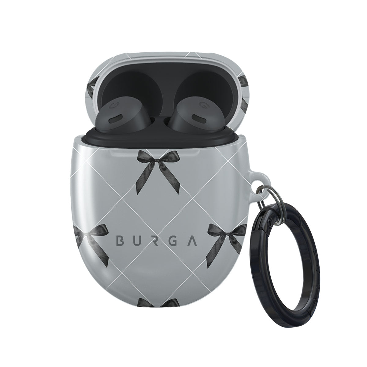 A subtle hint to a world of dance and soft melodies. Crisscrossing bows over a muted gray tone capture the flirtatious essence of the coquette-core aesthetic. Playful and sweet, our Coquette Google Pixel Buds Pro case cover design is perfect for those who find beauty in the details.