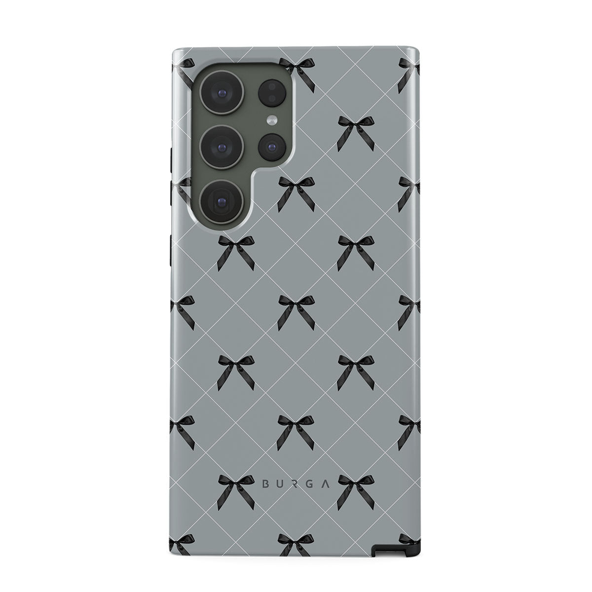 A subtle hint to a world of dance and soft melodies. Crisscrossing bows over a muted gray tone capture the flirtatious essence of the coquette-core aesthetic. Playful and sweet, our Coquette Samsung Galaxy S23 Ultra phone case design is perfect for those who find beauty in the details.