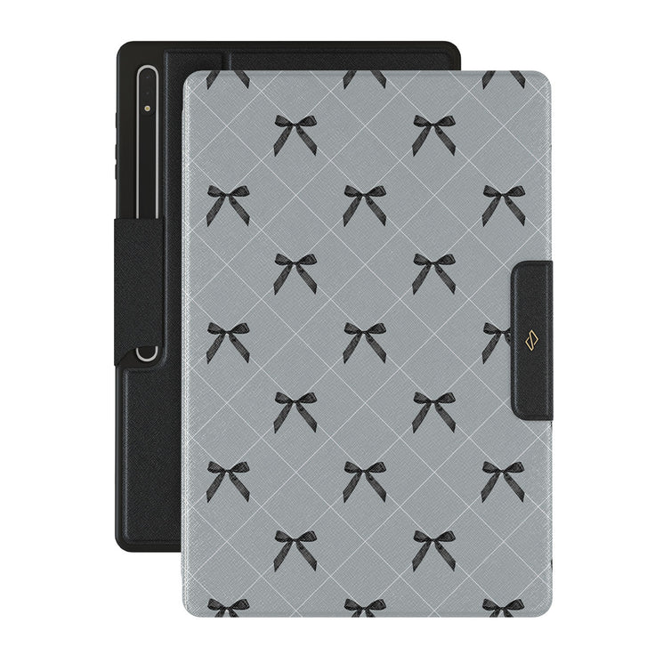 A subtle hint to a world of dance and soft melodies. Crisscrossing bows over a muted gray tone capture the flirtatious essence of the coquette-core aesthetic. Playful and sweet, our Coquette Samsung Galaxy Tab S9 Ultra folio case design is perfect for those who find beauty in the details.