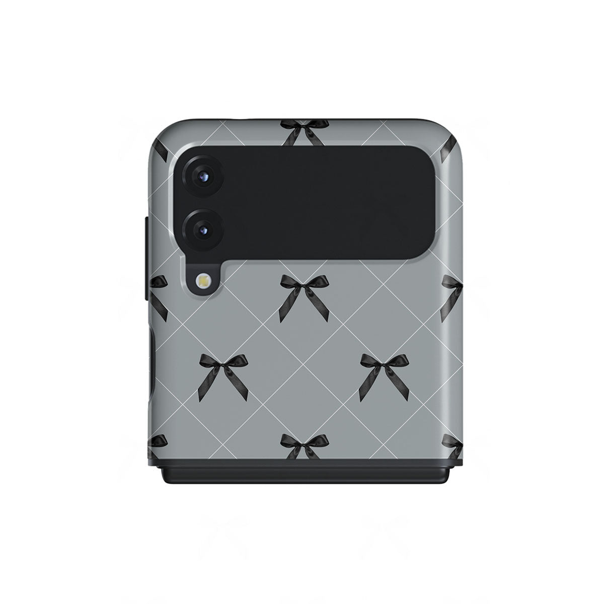 A subtle hint to a world of dance and soft melodies. Crisscrossing bows over a muted gray tone capture the flirtatious essence of the coquette-core aesthetic. Playful and sweet, our Coquette Samsung Galaxy Z Flip 3 phone case design is perfect for those who find beauty in the details.