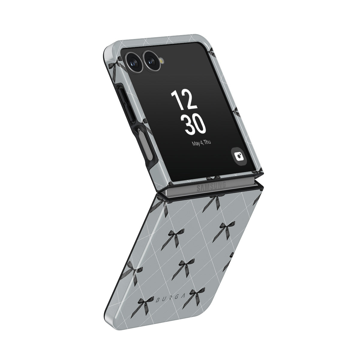 A subtle hint to a world of dance and soft melodies. Crisscrossing bows over a muted gray tone capture the flirtatious essence of the coquette-core aesthetic. Playful and sweet, our Coquette Samsung Galaxy Z Flip 7 phone case design is perfect for those who find beauty in the details.