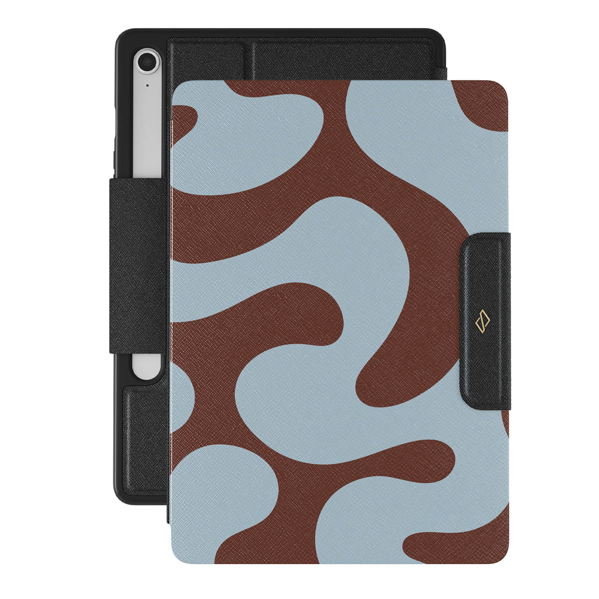 This design features: waves, abstract pattern, brown swirls, light blue swirls