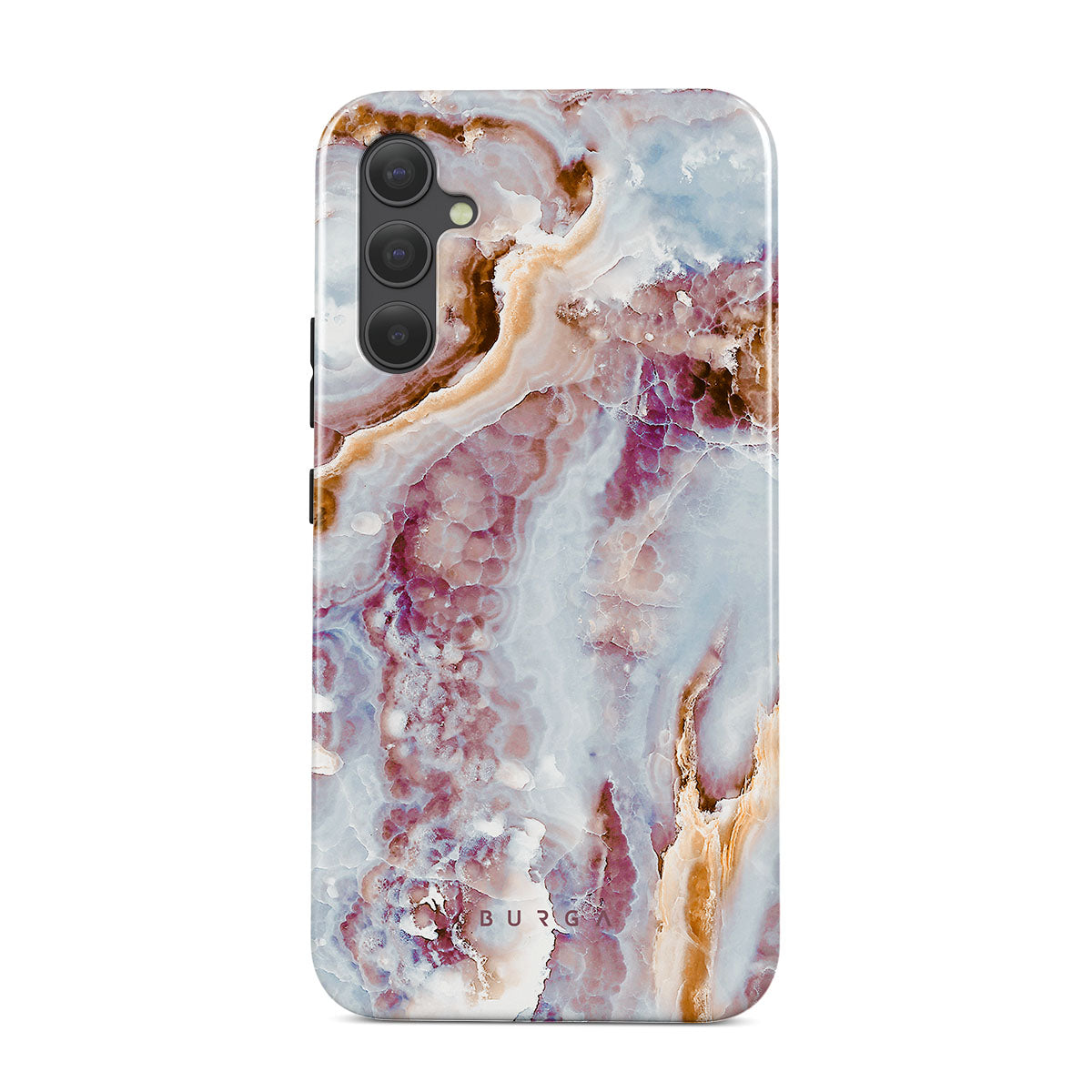 What frost can create on the surfaces is perfectly imperfect. The cute marble pattern of our hard-shell Samsung Galaxy A34 phone case inspired by the frozen leaves adds a splash of color in a dreamy blue background, becoming a beautiful part of anyone's style.