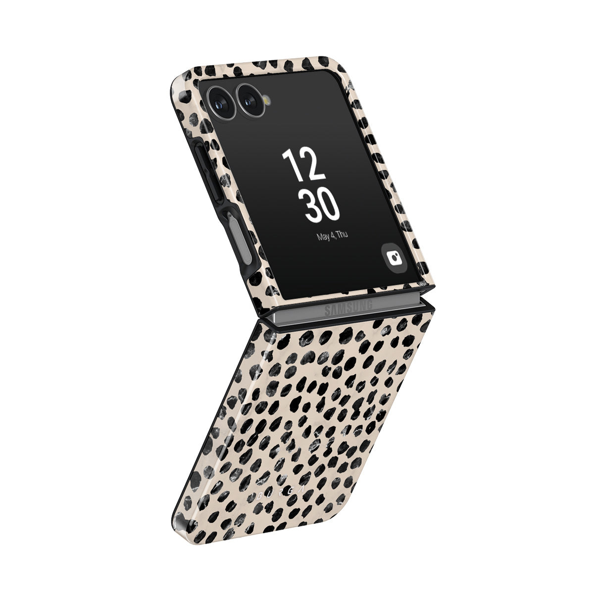 Cute cream color as a background for the unique pattern of asymmetrical black spots creates a real eye-catcher in our Almond Latte Samsung Galaxy Z Flip 7 phone case. The spotted pattern adds a touch of luxury to your phone, while the case's hard-shell nature offers much-needed protection making it a popular choice between fashion lovers.