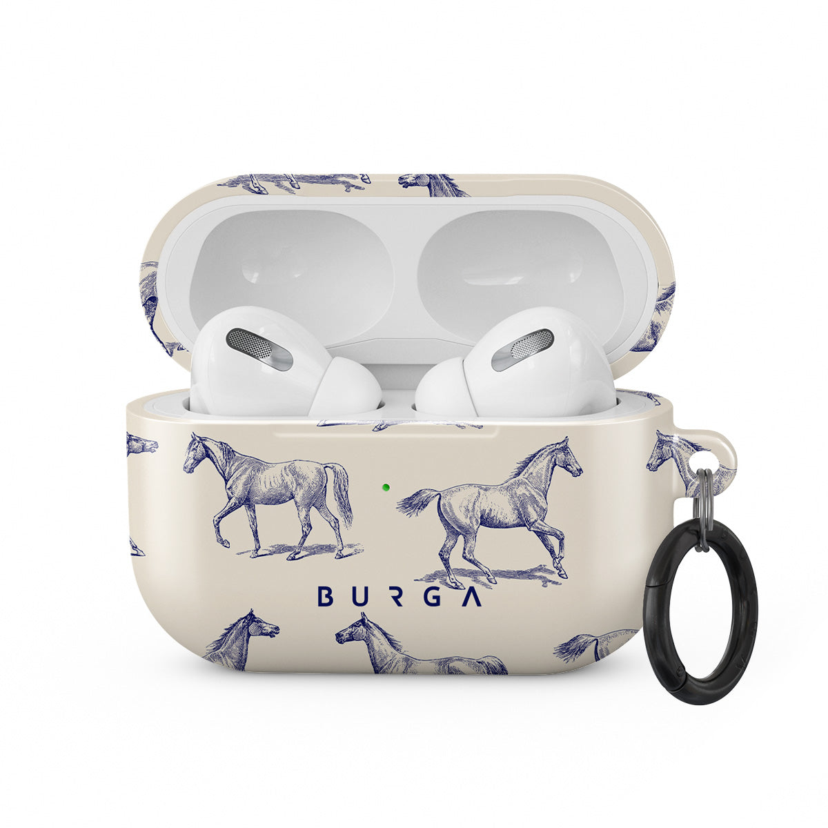 Introducing our Derby Race Apple Airpods Pro case cover designa portrait of elegance in motion on a soft nude canvas. Engraved in delicate blue contours, galloping horses dance upon the wind, frozen in an exquisite moment of grace.