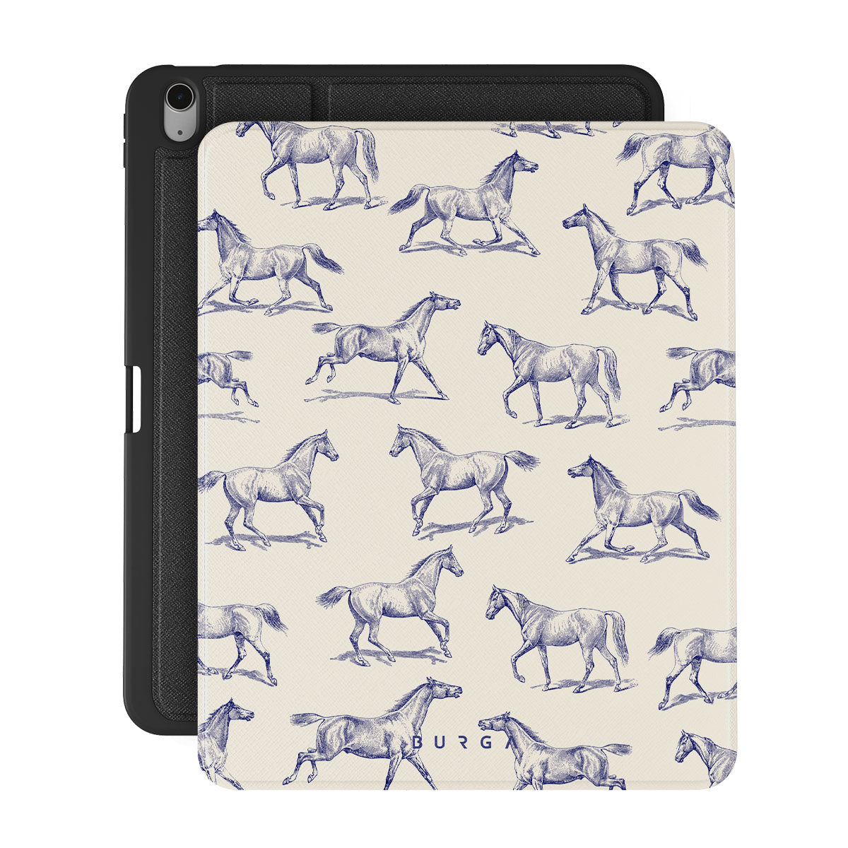 Introducing our Derby Race iPad Air 13 (7th/6th Gen) folio case design—a portrait of elegance in motion on a soft nude canvas. Engraved in delicate blue contours, galloping horses dance upon the wind, frozen in an exquisite moment of grace.