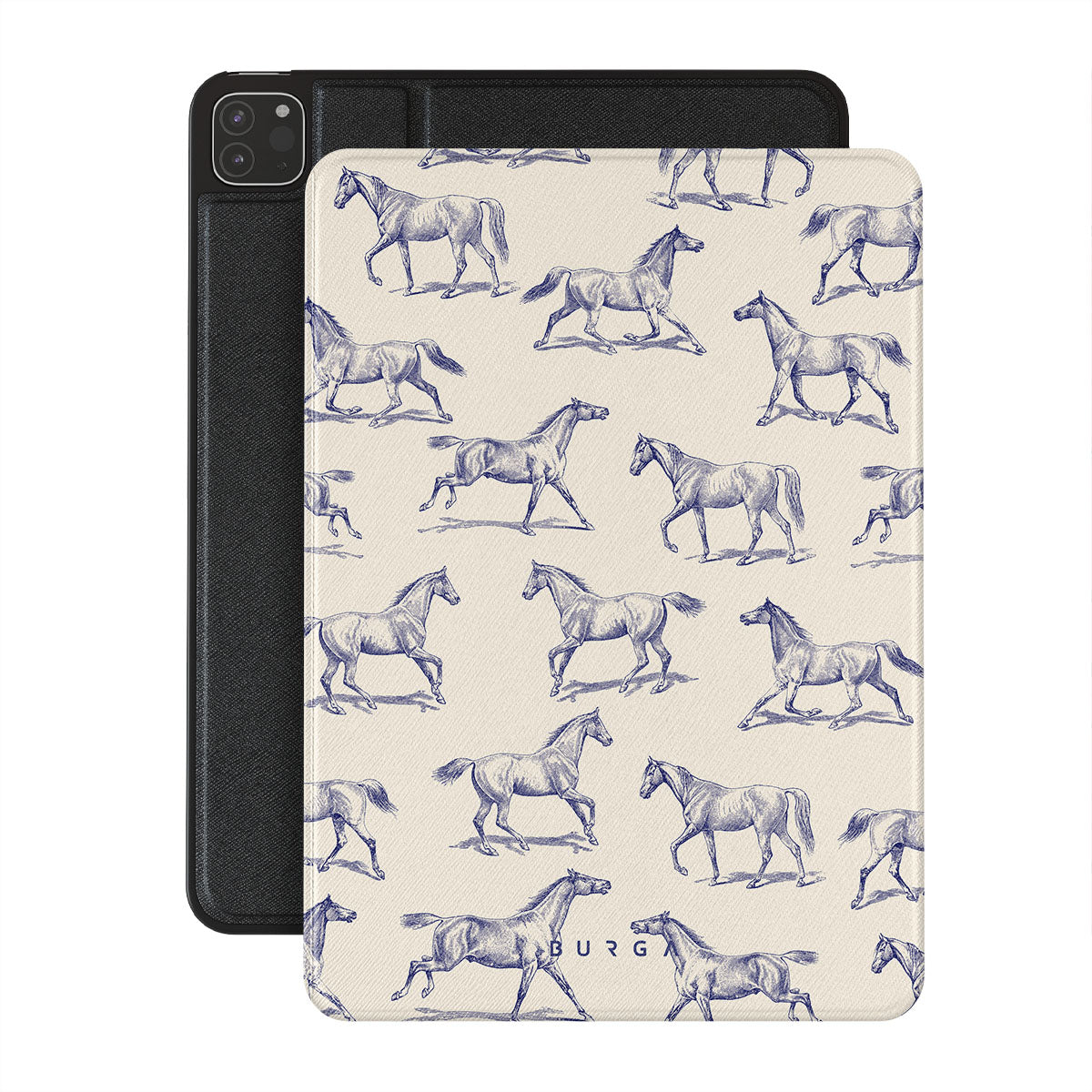 Introducing our Derby Race iPad Pro 11 (2nd/1st Gen) folio case designa portrait of elegance in motion on a soft nude canvas. Engraved in delicate blue contours, galloping horses dance upon the wind, frozen in an exquisite moment of grace.