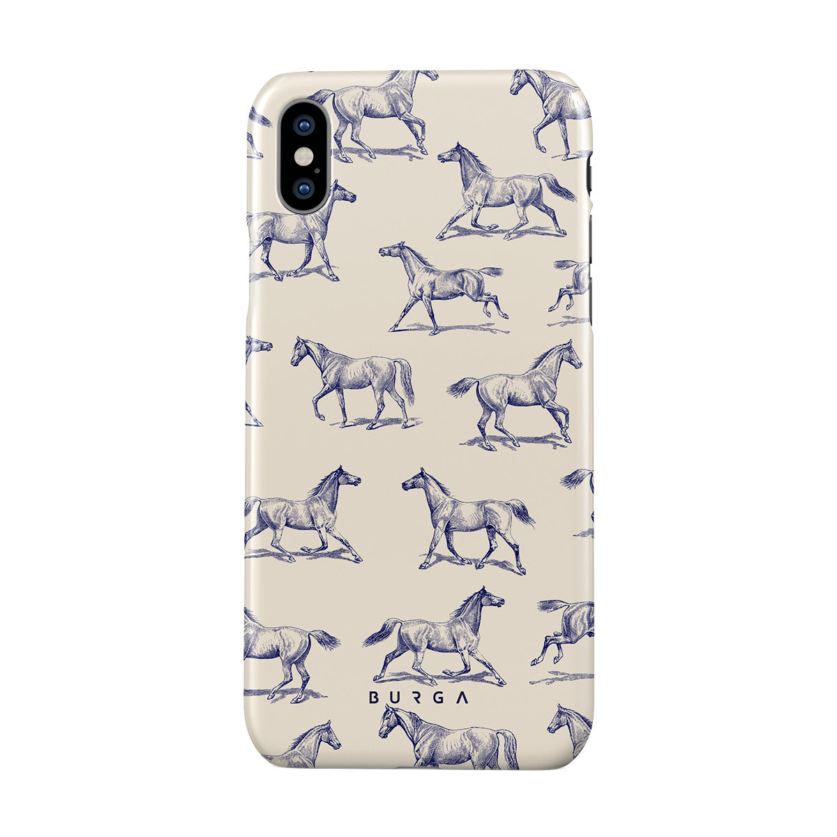 Introducing our Derby Race iPhone XS Max phone case designa portrait of elegance in motion on a soft nude canvas. Engraved in delicate blue contours, galloping horses dance upon the wind, frozen in an exquisite moment of grace.