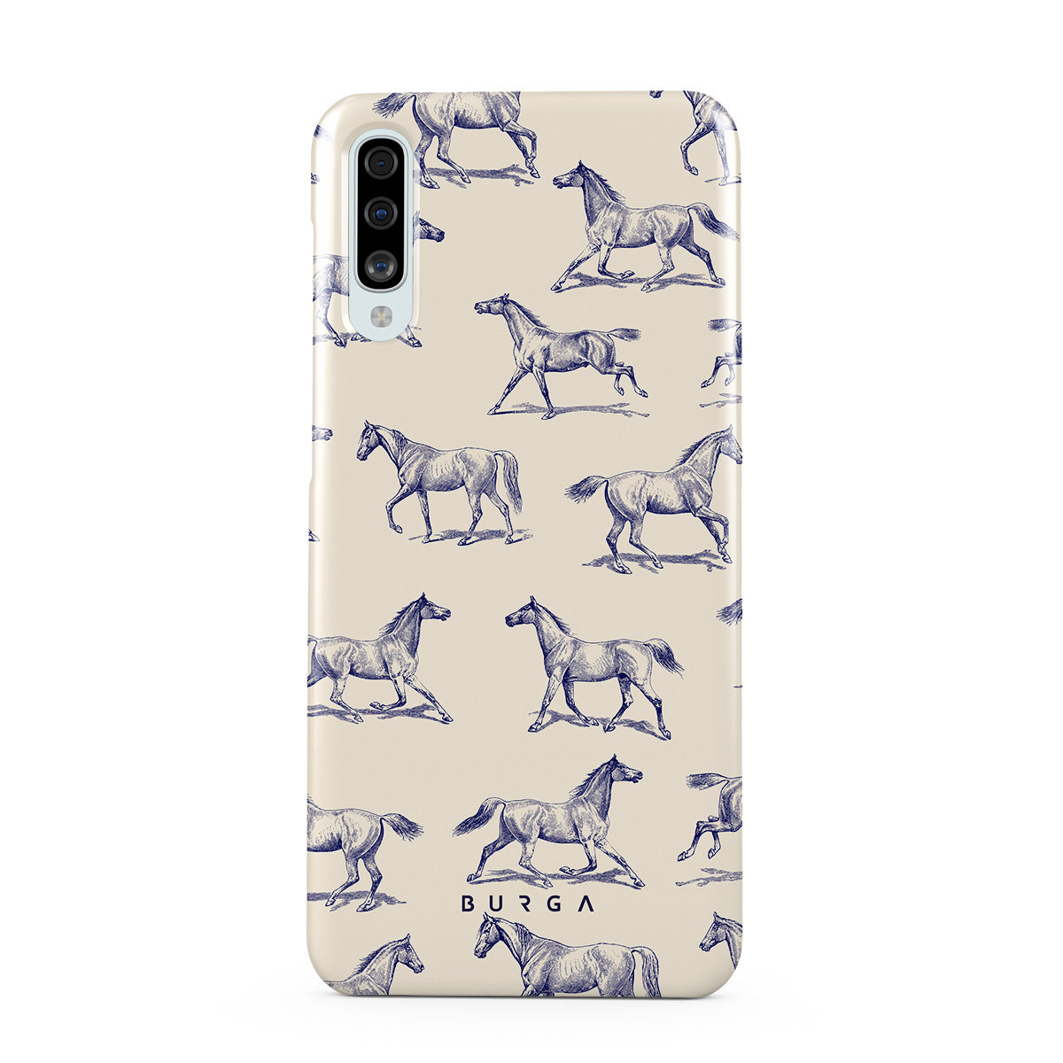 Introducing our Derby Race Samsung Galaxy A50 phone case designa portrait of elegance in motion on a soft nude canvas. Engraved in delicate blue contours, galloping horses dance upon the wind, frozen in an exquisite moment of grace.
