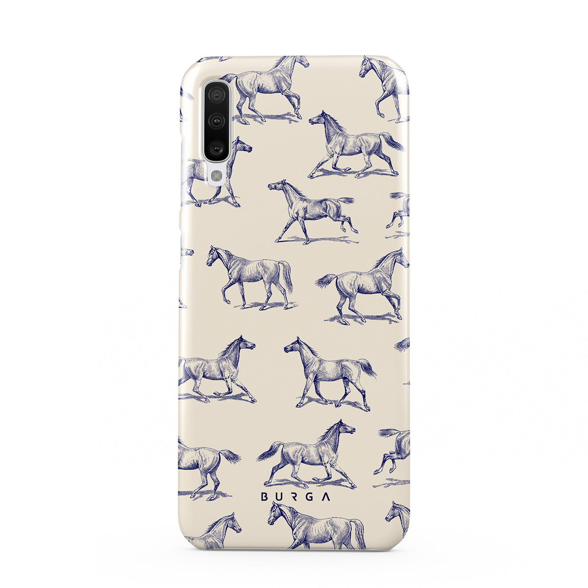Introducing our Derby Race Samsung Galaxy A70 phone case designa portrait of elegance in motion on a soft nude canvas. Engraved in delicate blue contours, galloping horses dance upon the wind, frozen in an exquisite moment of grace.
