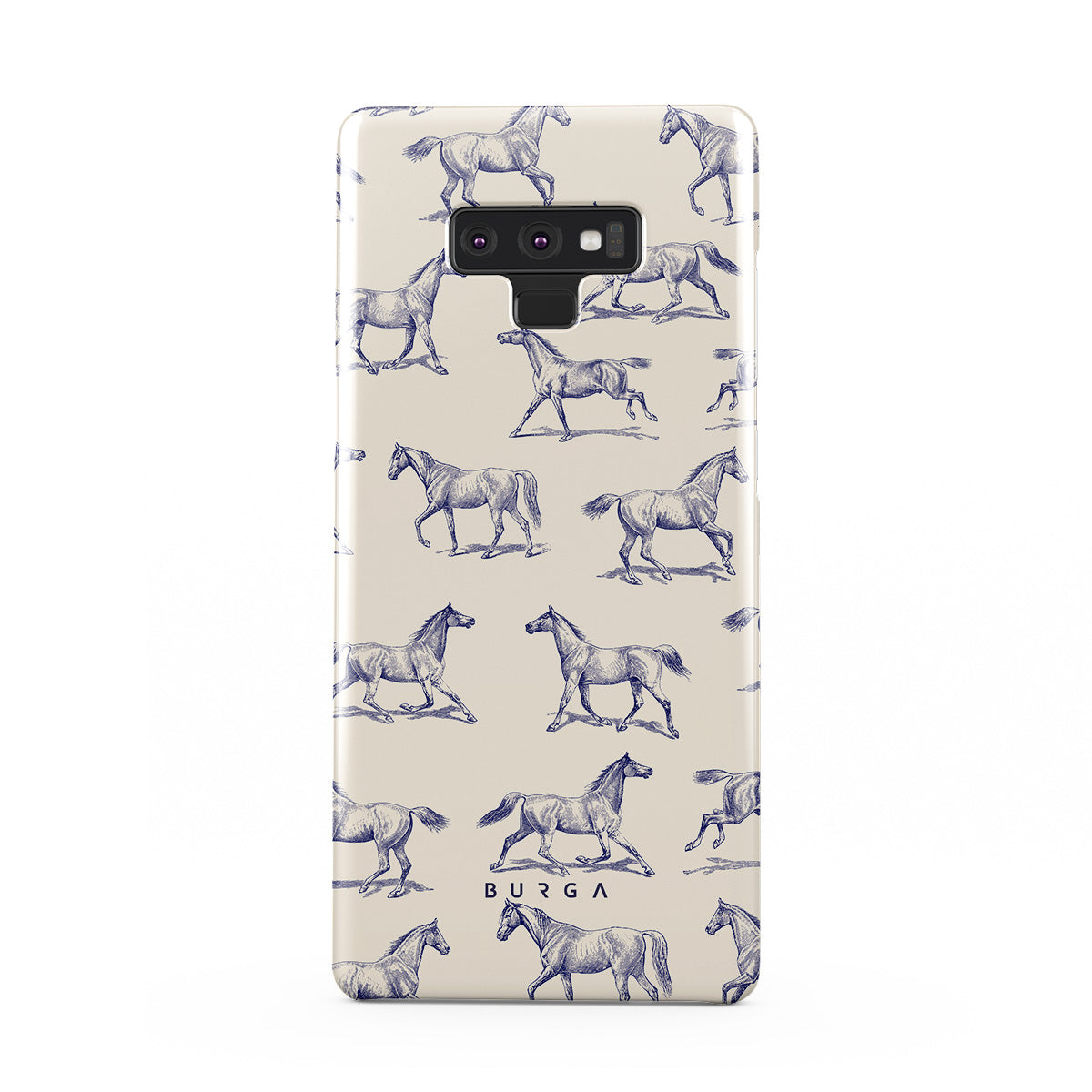 Introducing our Derby Race Samsung Galaxy Note 9 phone case designa portrait of elegance in motion on a soft nude canvas. Engraved in delicate blue contours, galloping horses dance upon the wind, frozen in an exquisite moment of grace.