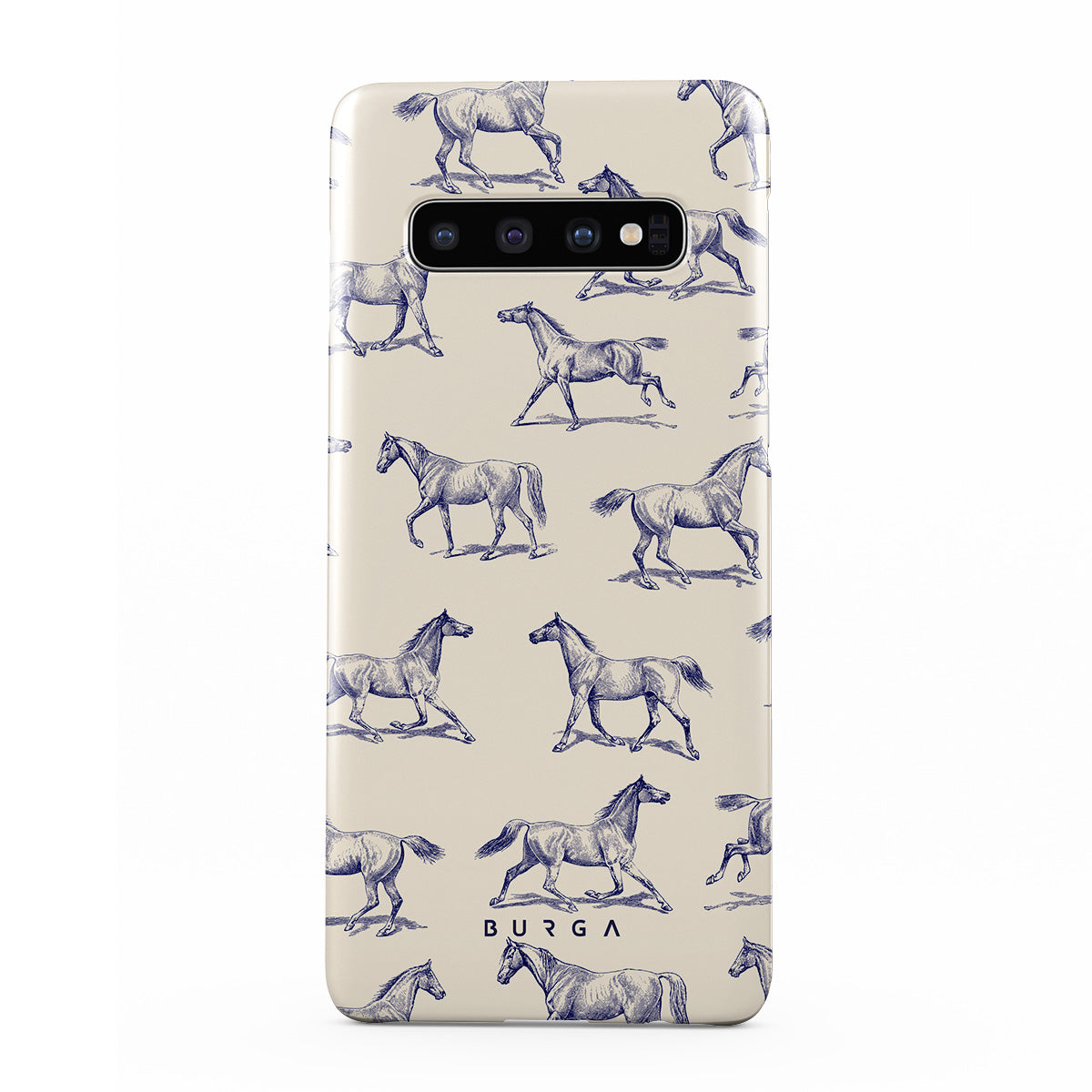 Introducing our Derby Race Samsung Galaxy S10 Plus phone case designa portrait of elegance in motion on a soft nude canvas. Engraved in delicate blue contours, galloping horses dance upon the wind, frozen in an exquisite moment of grace.