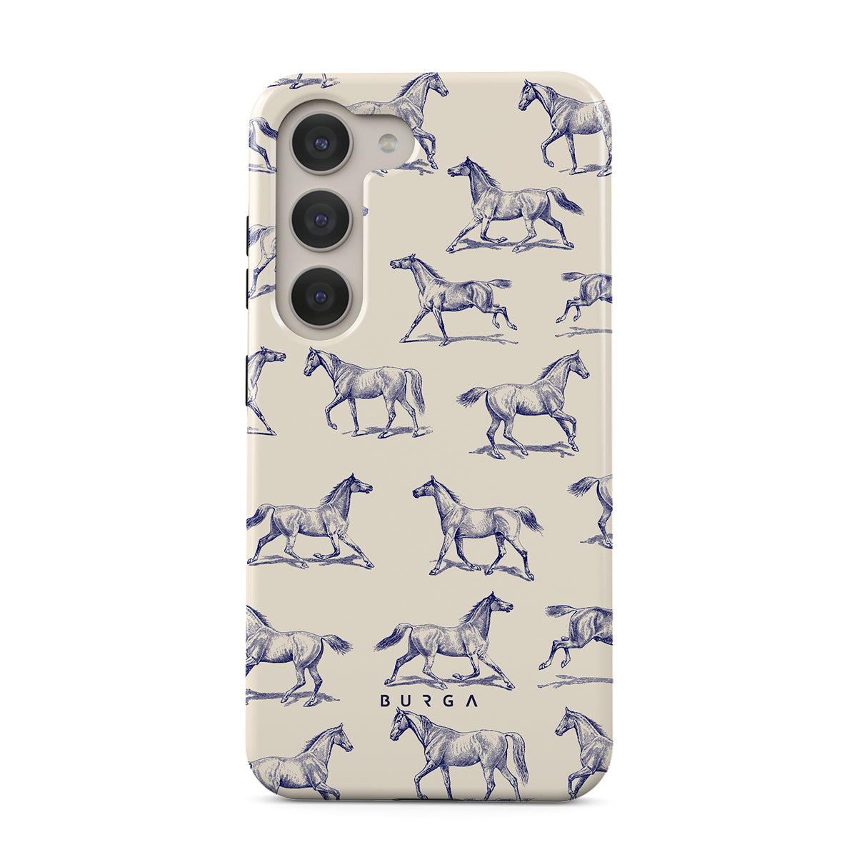 Introducing our Derby Race Samsung Galaxy S23 Plus phone case design—a portrait of elegance in motion on a soft nude canvas. Engraved in delicate blue contours, galloping horses dance upon the wind, frozen in an exquisite moment of grace.