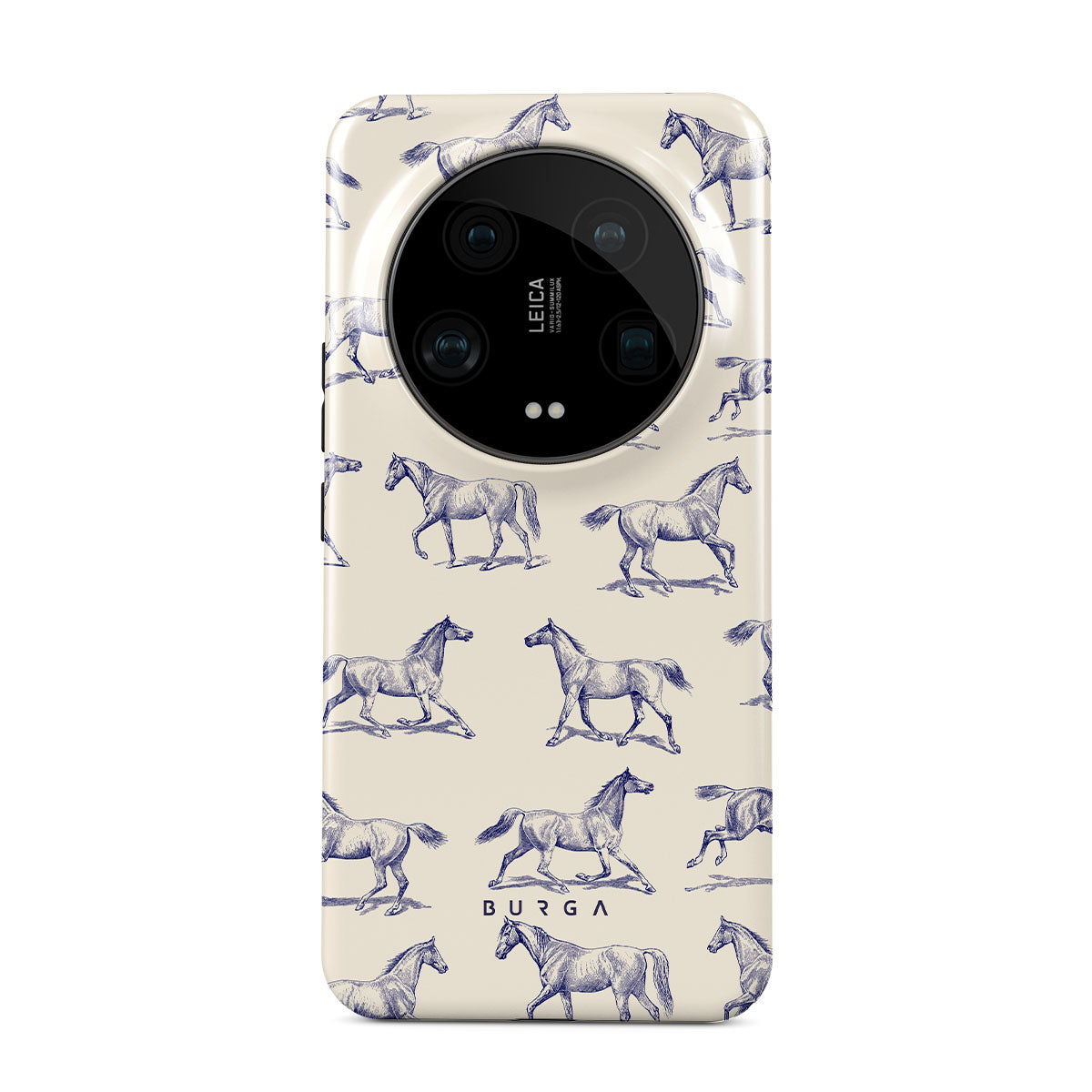Introducing our Derby Race Xiaomi 14 Ultra phone case design—a portrait of elegance in motion on a soft nude canvas. Engraved in delicate blue contours, galloping horses dance upon the wind, frozen in an exquisite moment of grace.