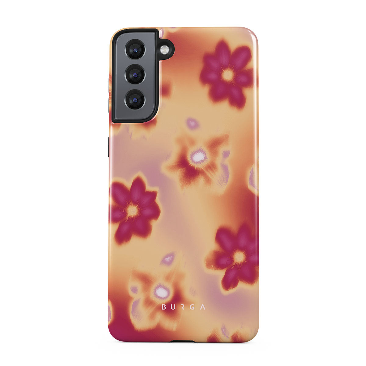 Get lost in the allure of our Divine Samsung Galaxy S21 phone case design. Picture blossoms bathed in fiery hues of pink and orange, each seemingly charged with life's raw energy. Set against a canvas that radiates power and warmth, these flowers offer more than just beauty; they resonate with the essence that binds us all.