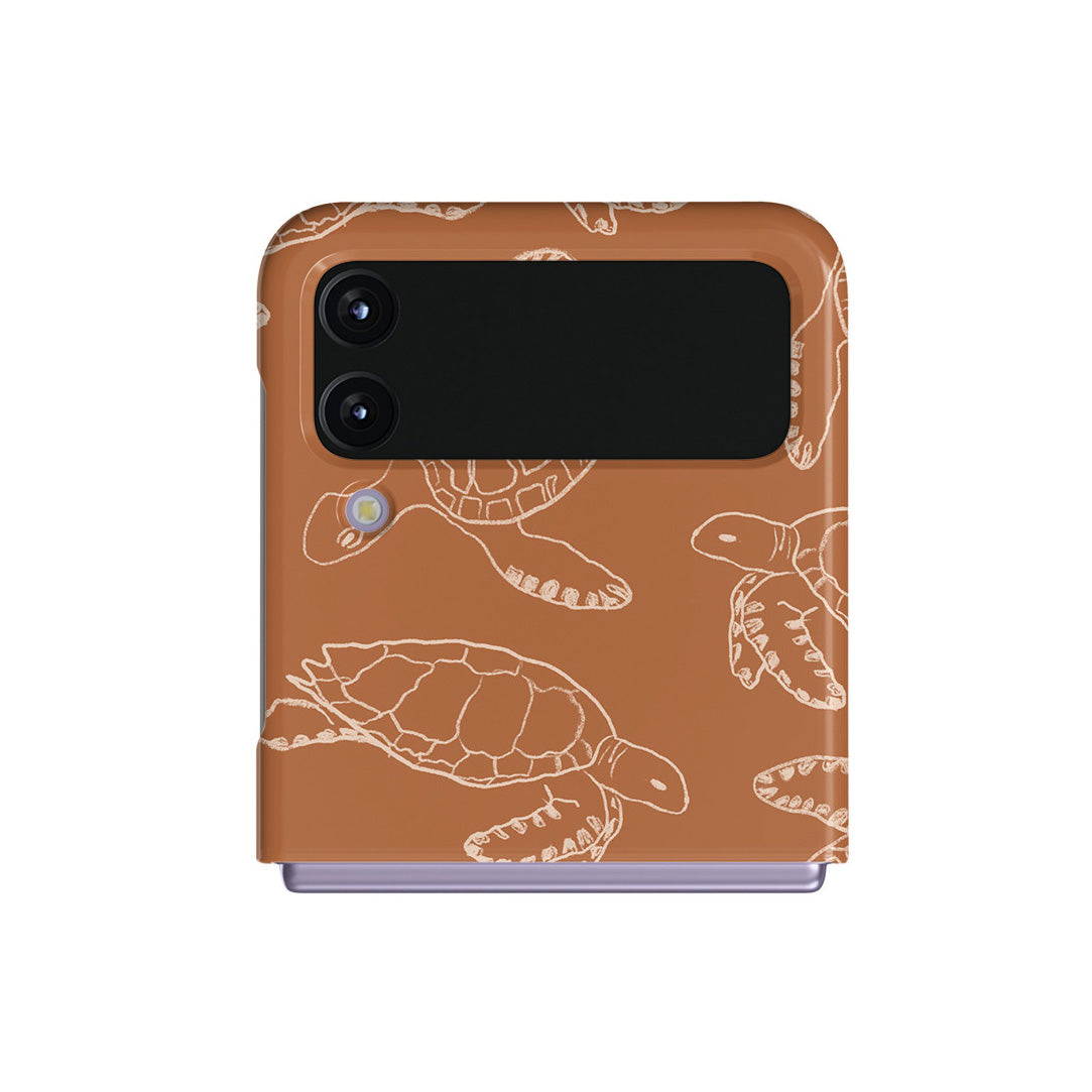 Step into a world of pure bliss and turtle magic with our Earth Shell design. The rich earth tones creating a calming ambiance blend beautifully with the playful turtles floating into adventure. Embark on a thrilling escapade to reconnect with nature with our Earth Shell Samsung Galaxy Z Flip 4 case.