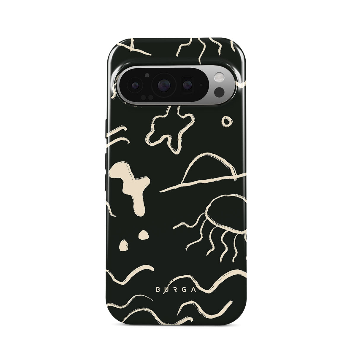 Our Eclipse Google Pixel 9 Pro design reflects the enigmatic beauty of the ocean during a solar eclipse. The dark hues and bright accents represent how the light dances on the water, while the waves and jellyfish capture the serene yet dynamic nature of the ocean.
