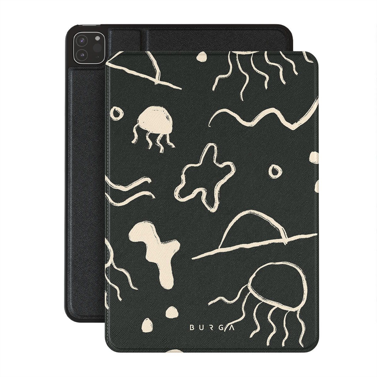 Our Eclipse iPad Pro 11 (2nd/1st Gen) folio case reflects the enigmatic beauty of the ocean during a solar eclipse. The dark hues and bright accents represent how the light dances on the water, while the waves and jellyfish capture the serene yet dynamic nature of the ocean.
