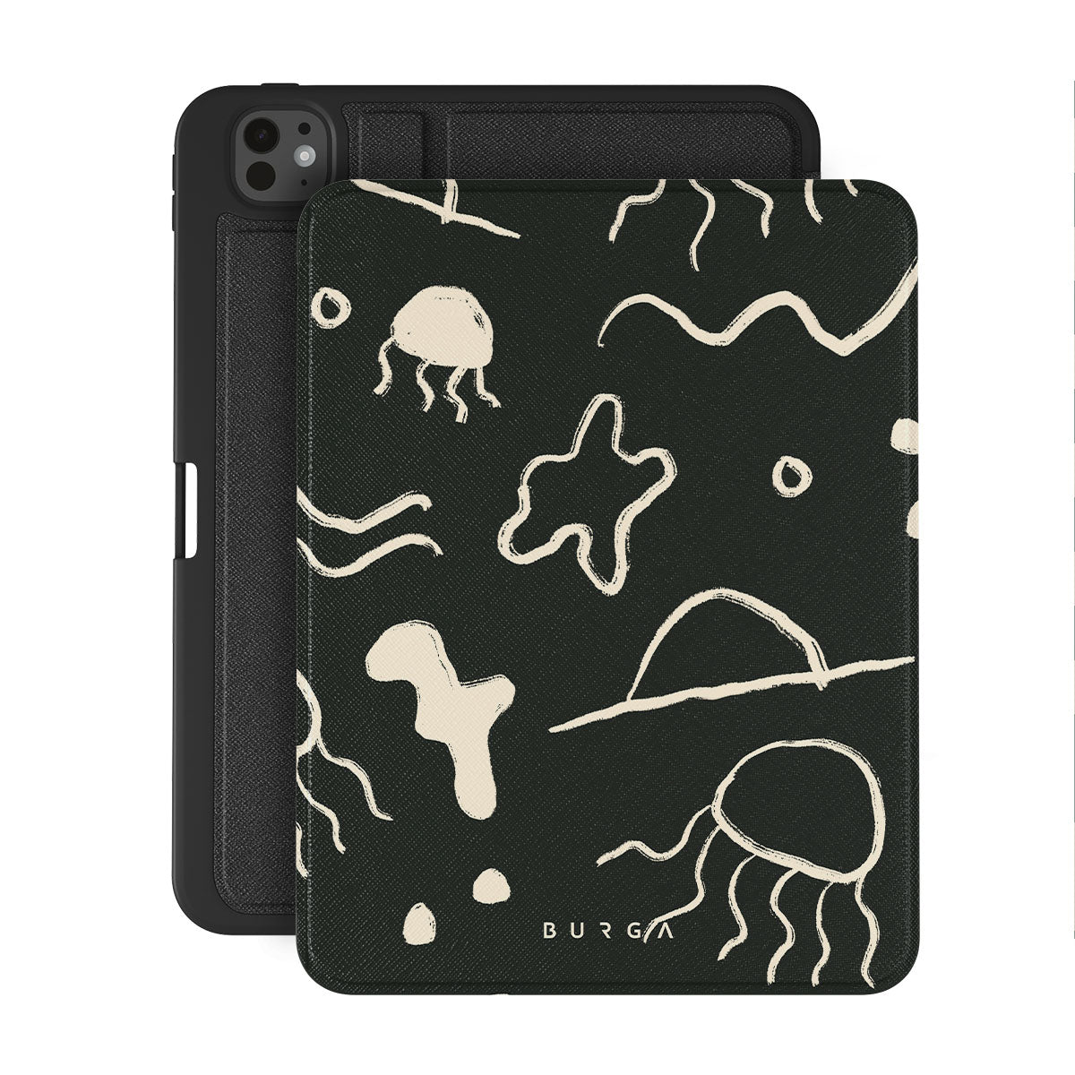 Our Eclipse iPad Pro 11 (8th/7th Gen) folio case reflects the enigmatic beauty of the ocean during a solar eclipse. The dark hues and bright accents represent how the light dances on the water, while the waves and jellyfish capture the serene yet dynamic nature of the ocean.